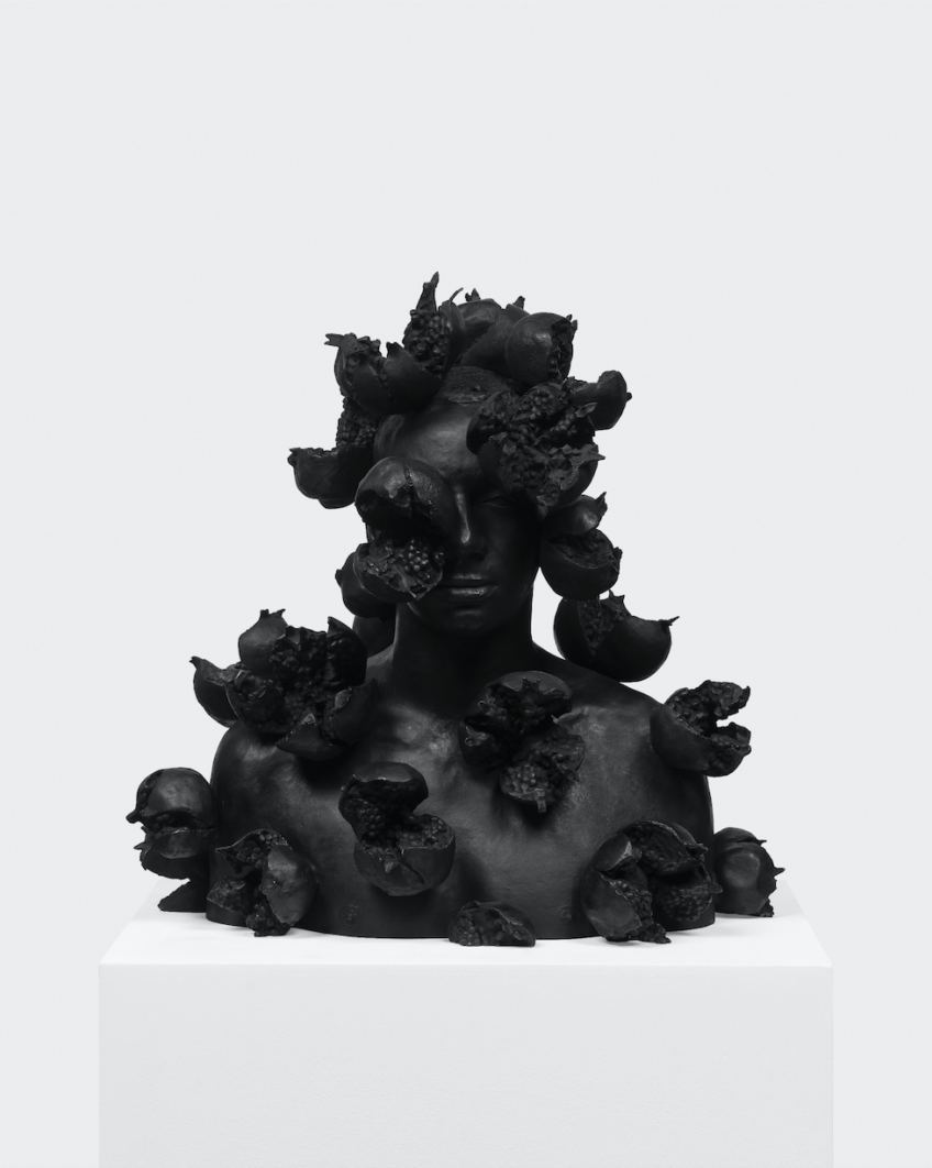 Mehdi-Georges Lahlou’s bust of a grenadier is in bloom with ripe pomegranates. Dozens of pieces of fruit are bursting open from his neck, eyes, collarbone, and from between his shoulder blades. Though the sculpture is cast in dark bronze, the suggestion of the fruit’s bright red juice is tangible.